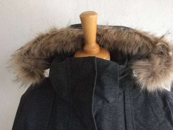 Abnehmbare Kapuze und Fellkante.