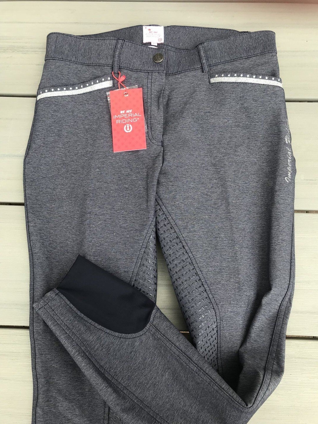 Die Strasssteine und Glitzerapplikationen verzieren die Taschen auf der Vorder- und Rückseite, Gürtelschlaufen und unser Imperial Riding Logo.