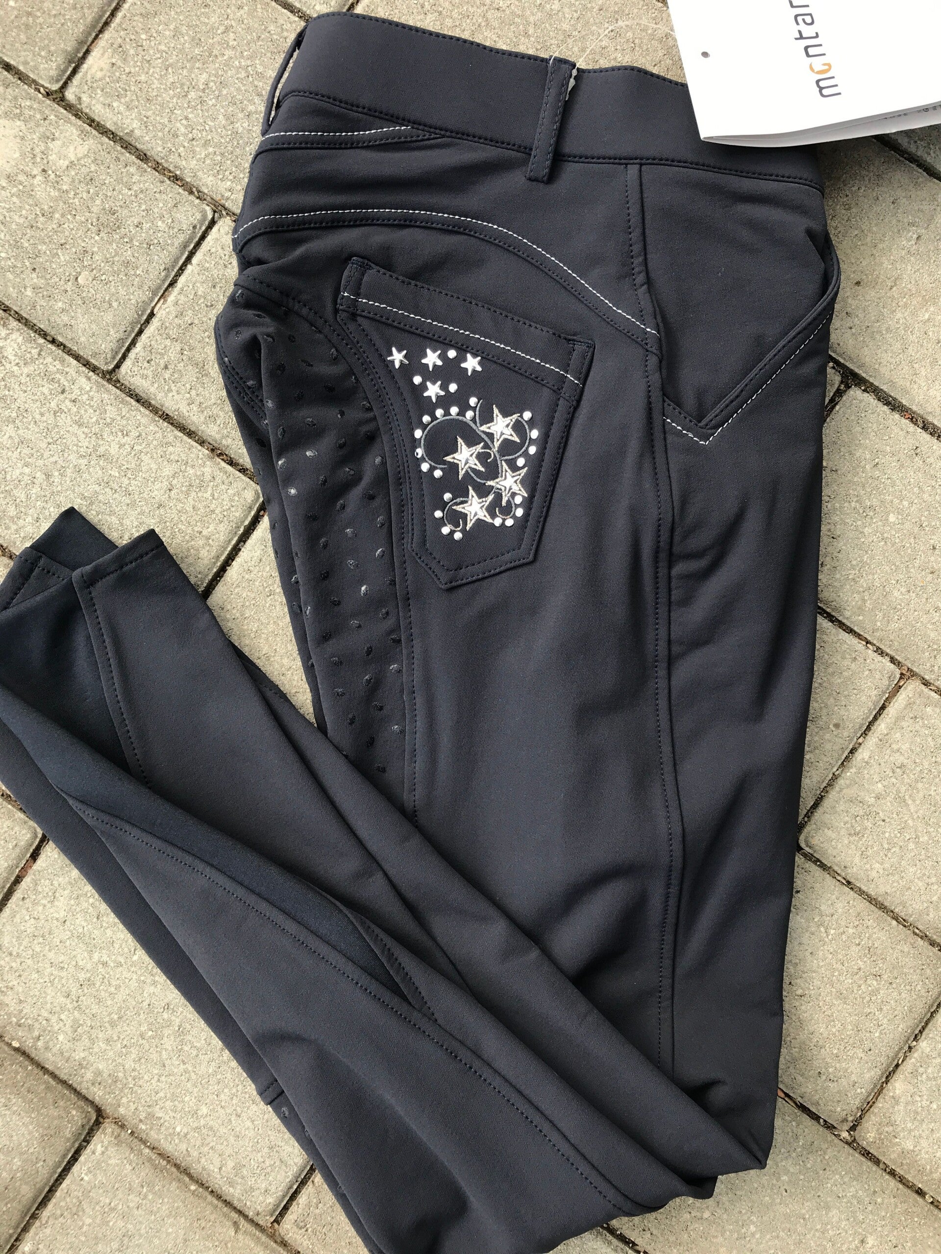 Der Silikonsitz bietet mehr Bewegungsfreiheit und eine bessere Dehnbarkeit als bei normalen Reithosen. - Stretcheinsatz an den Knöcheln. - Mittelhohe Taille. - 2 Taschen auf der Rückseite mit Sterndetails. - 2 Taschen vorne - silber Ziernähte