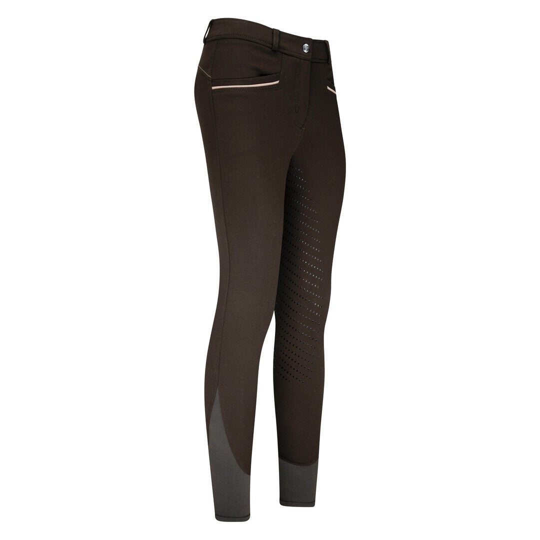 Der Vollbesatz dieser Reithose besteht aus Silikon und ist im Triangel Pattern aufgebracht. Die elastischen Beinenden wurden in zum Besatz korrespondierender Farbe gestaltet.